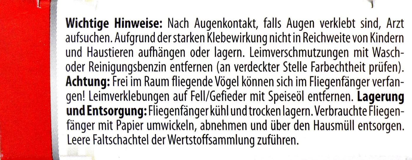 Fliegen stören nicht nur durch monotones Summen, sondern sie hinterlassen auch regelmäßig dicke Flecken auf der gerade neu geputzten Scheibe. Mit dem Aeroxon Fliegenfänger endet der nervige Rundumflug abrupt. Die spiralförmige Leimfalle wirkt bis zu 8 Wochen und ist für Räumlichkeiten von 8 – 10 qm geeignet. Auch Obstfliegen werden angelockt! Die Leimfalle hält eine ganze Saison! Hast du neugierige Haustiere, solltest du die Klebefallen außer Reichweite aufhängen, damit dein Tier nach Kontakt nicht verklebt aus der Wäsche guckt!