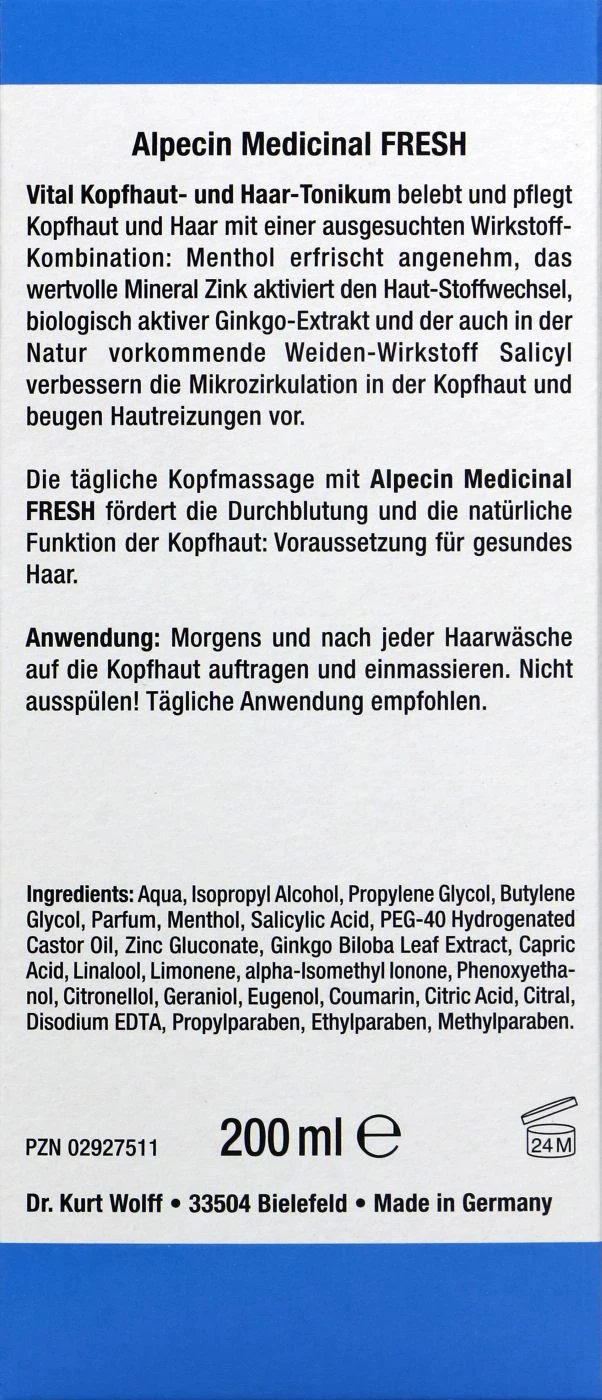 Alpecin Medicinal Fresh pflegt und vitalisiert die Kopfhaut und die Haare durch eine reiche Wirkstoffkombination aus Menthol, Zink und Ginkgo-Extrakt. Menthol erfrischt und fördert die Durchblutung, Zink kräftigt den Kopfhautstoffwechsel und verbessert somit das natürliche Gleichgewicht der Kopfhaut. Ginkgo-Extrakt wirkt ebenfalls aktivierend auf den Stoffwechsel und fördert die Mikrozirkulation. Das Tonikum in die Kopfhaut einmassieren und nicht auswaschen.