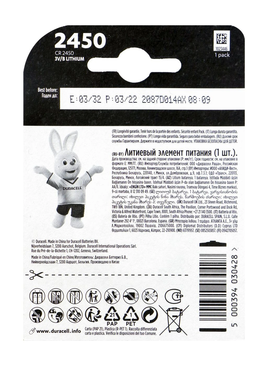Duracell 2450 Long Lasting Power ist eine Lithium Batterie mit 3 V. Die runde Knopfzellenbatterie verspricht dauerhafte Leistung für alle Spezialgeräte. Die Batterie kann bis zu 10 Jahren gelagert werden und ist jederzeit einsatzbereit für Geräte, wie Waagen, Wearables und medizinische Geräte.