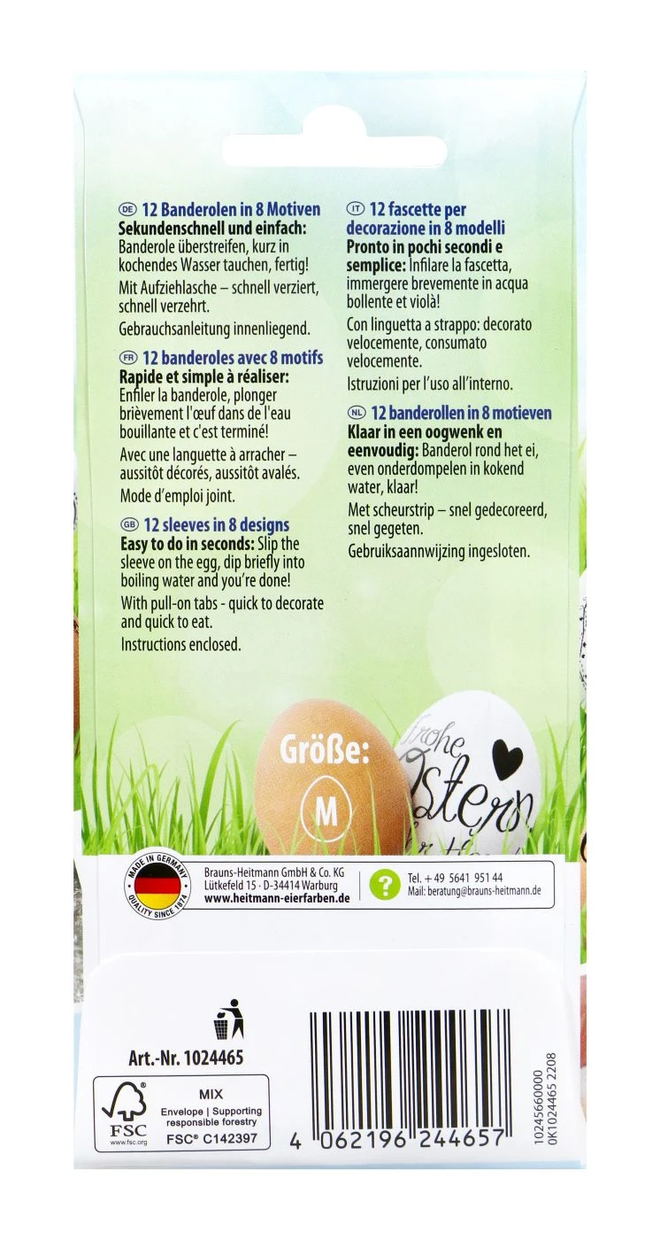 Die Heitmann Eierbanderolen sind eine schnelle und schöne Variante um die Ostereier zu gestalten. Im Set Ei Love You sind insgesamt 12 Banderolen enthalten mit acht verschiedenen Motiven.
