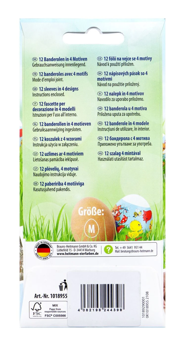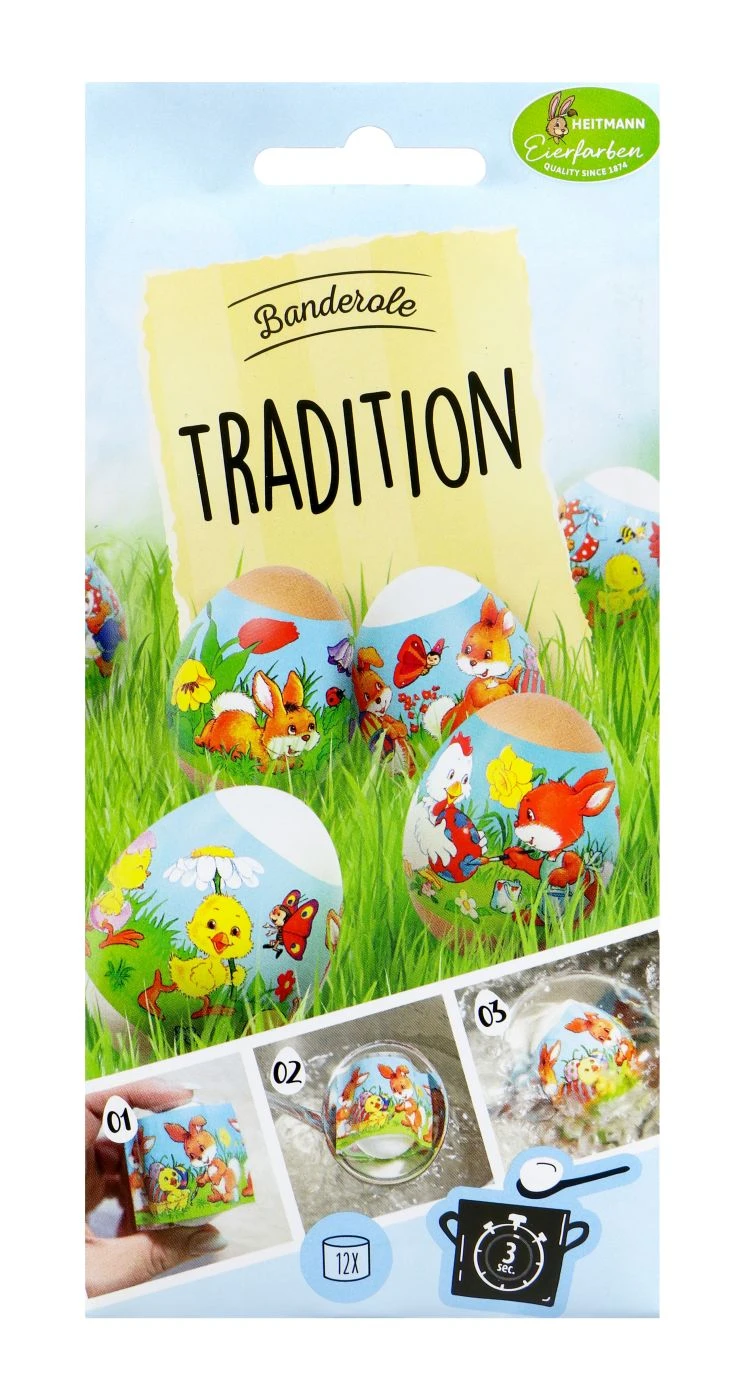 Die Heitmann Eierbanderolen sind eine schnelle und schöne Variante um die Ostereier zu gestalten. Im Set Tradition sind insgesamt 12 Banderolen enthalten mit vier verschiedenen Motiven.