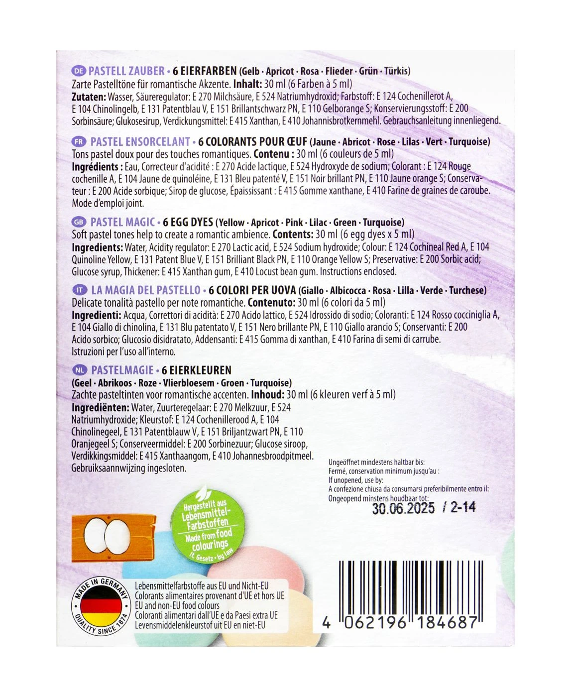 Eierfarben Zartes Pastell – romantisch schön. Das Färbeset enthält 5 Eierfarben (Gelb, Rosa, Flieder, Grün, Türkis). Die romantischen Pastelltöne eignen sich am Besten für weiße Eier.