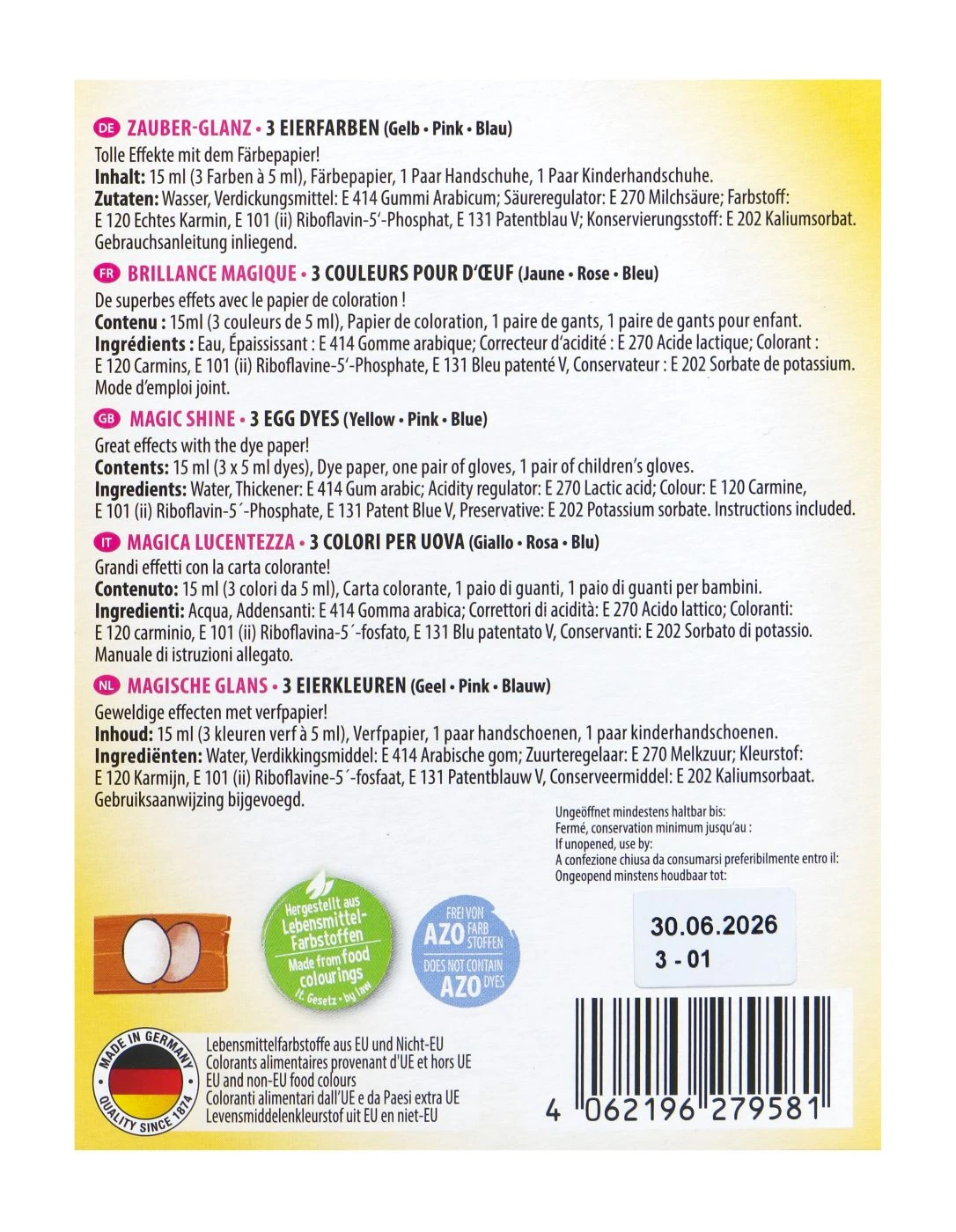 Heitmann Eierfarben Zauberglanz sind eine tolle Art mit Färbepapier die Eier zu gestalten. Das Set enthält drei Farben (Gelb, Pink, Blau)