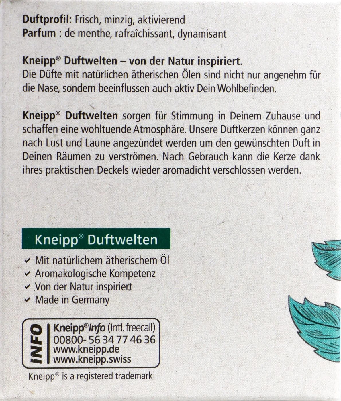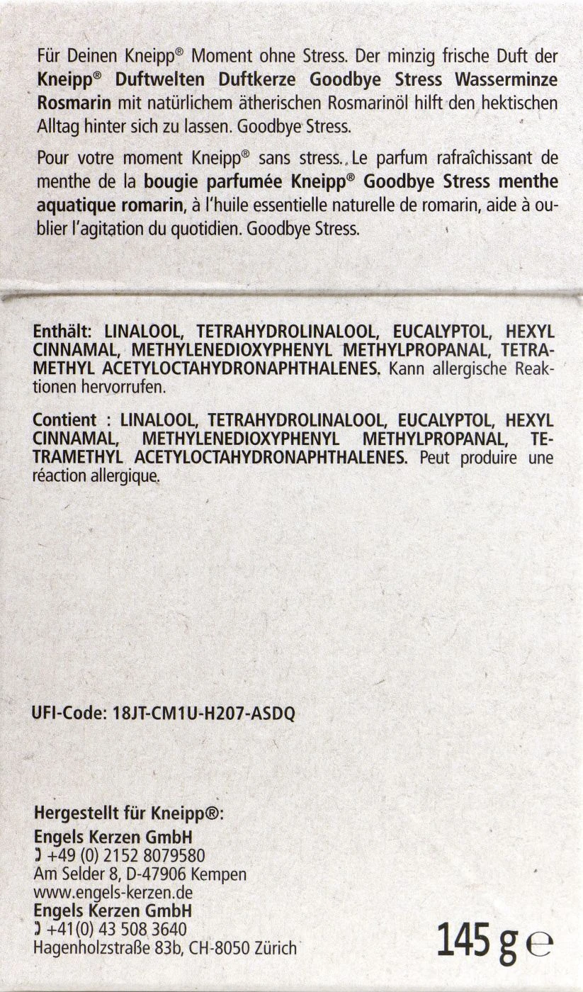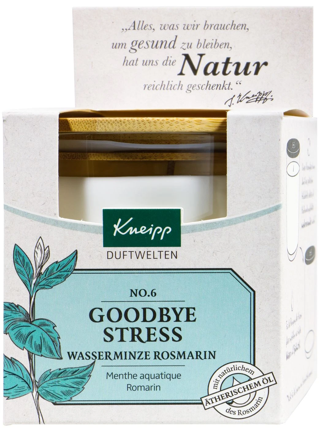 Kneipp Duftkerze Goodbye Stress ist ein Wohnaccessoire. Die Kerze enthält ätherisches Rosmarinöl, das einen frischen, minzigen Geruch vertsrömt. Der Duft wirkt aktivierend und stressmindernd.
