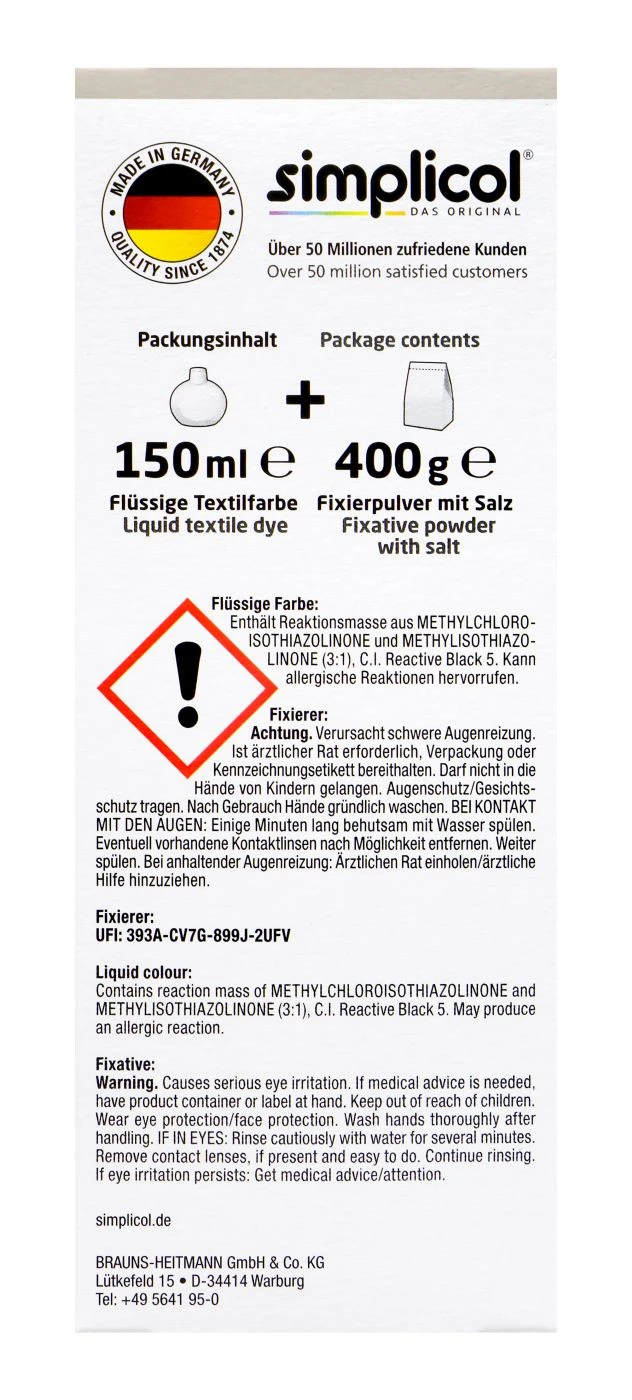 Packungsinhalt: 150 ml flüssige Textilfarbe + 400 g Fixierpullver
