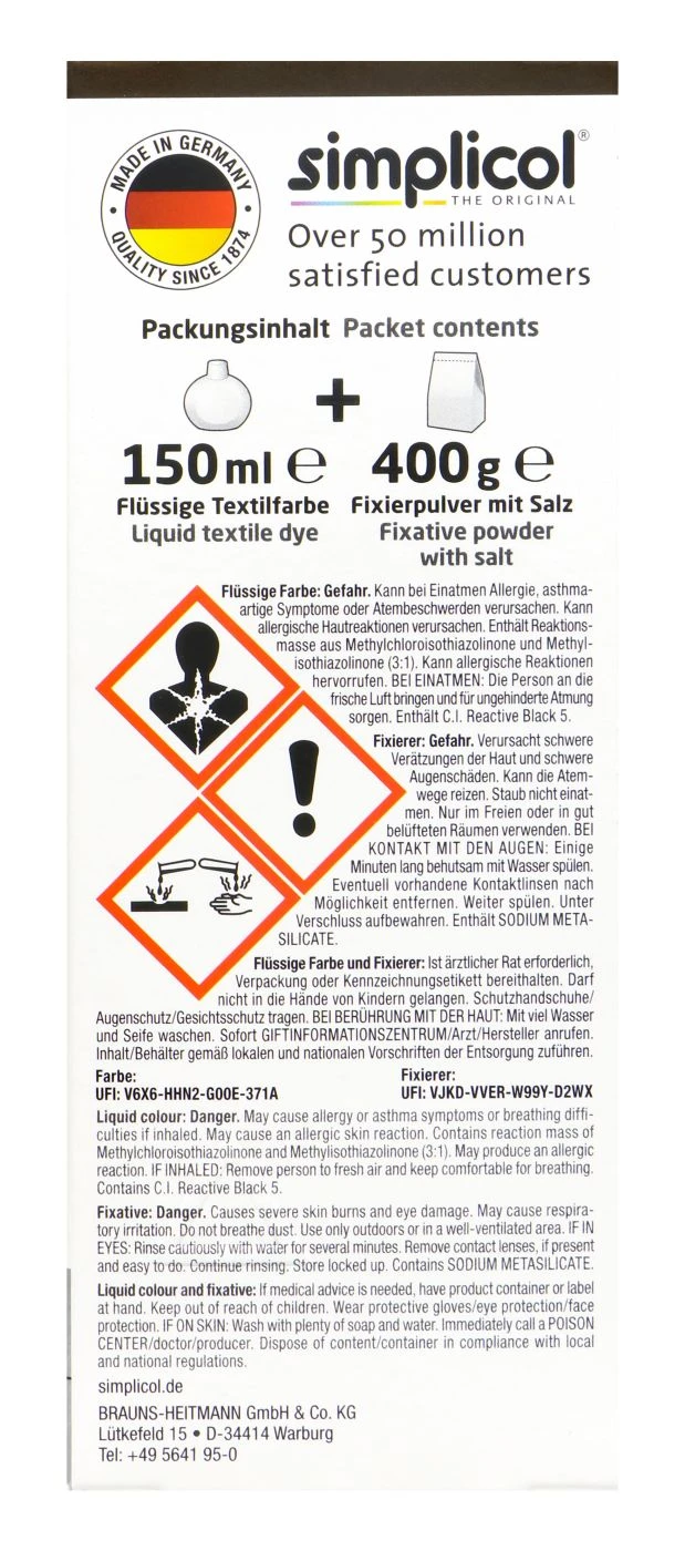 Packungsinhalt: 150 ml flüssige Textilfarbe + 400 g Fixierpullver