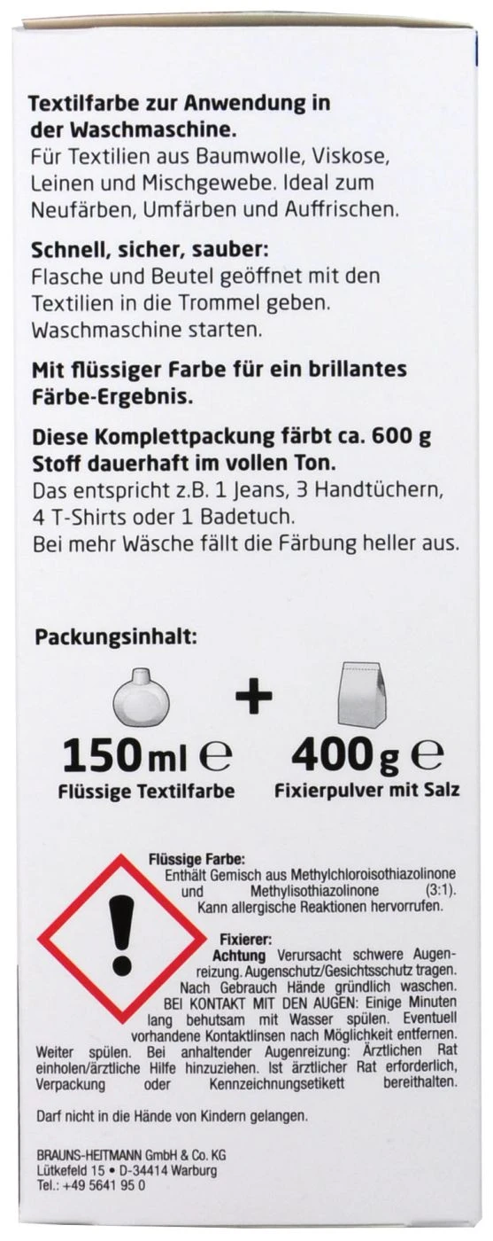 Packungsinhalt: 150 ml flüssige Textilfarbe + 400 g Fixierpullver
